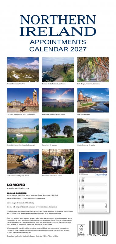 The selection of stunning images of Northern Ireland included are: Mourne Mountains, Co Down; Dunluce Castle, Bushmills, Co Antrim; Dark Hedges, Stranocum, Co Antrim; City Walls and Guildhall, Derry–Londonderry; Beaghmore Stone Circles, Co Tyrone; Newcastle, Co Down; Enniskillen Castle, River Erne, Co Fermanagh; Navan Fort, Co Armagh; Giant’s Causeway, Co Antrim; Custom House and Big Fish, Belfast; Glenariff Forest Park, Co Antrim; Titanic Belfast.
