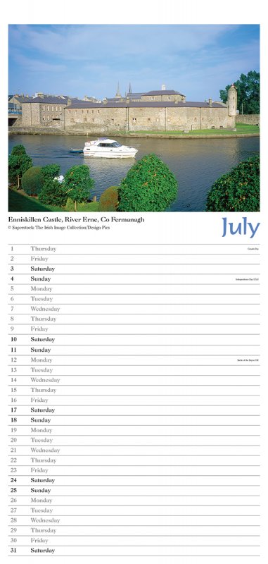 This 12 page appointments format calendar is a slim wall calendar with an image at the top of each page and a grid below with one line per day for reminders and engagements. The calendar dimensions are 35cm x 17cm.