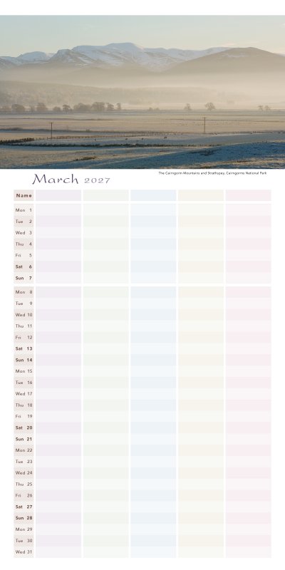 This is a 24 page engagement style wall calendar, opening to double size with a full page image on the top and a date box grid below for note taking, split into columns to allow space of all of the family's appointments and plans. The calendar's dimensions are 30cm x 30cm (60cm x 30cm when opened).