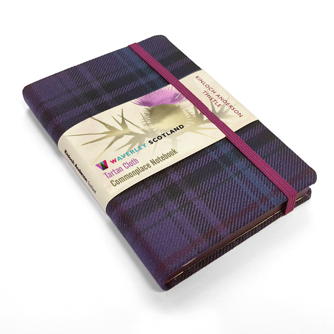 The Waverley Scotland Tartan Cloth Commonplace Notebooks each with 176 pages (left blank, right ruled), acid free, threadsewn, 80gsm cream shade pages, are bound in genuine SCottish tartan cloth over board with round cornered covers and bookblock corners, stained edges and a matching leastic enclosure. Each volume has a ribbon marker and an expandable inner note holder made of cardboard and cloth, and removable booklet with background notes, a Clan Map of Scotland, and with an individual bookmark giving detail on the specific tartan used for the binding.