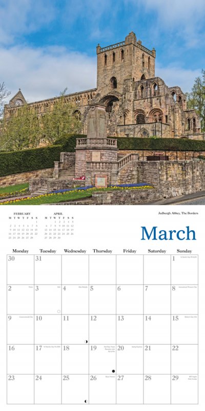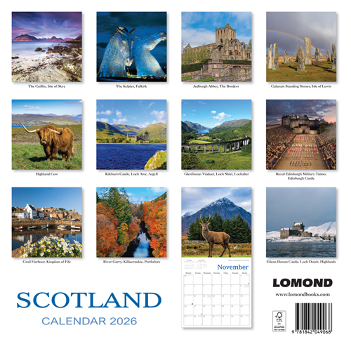 Enjoy wonderful scenic images throughout the year with our range of 2026 calendars. This 24 page wall calendar offers a full page for an image and a full page of date boxes below. The calendar dimensions are 30cm x 30cm (60cm x 30cm when opened). The selection of stunning images of Scotland included are: the Cuillin, Isle of Skye; the Kelpies, Falkirk; Jedburgh Abbey, Scottish Borders; Calanais Standing Stones, Isle of Lewis; Highland Cow; Kilchurn Castle, Loch Awe, Argyll; Glenfinnan Viaduct, Loch Shiel, Lochaber; Royal Edinburgh Military Tattoo, Edinburgh Castle; Crail Harbour, Kingdom of Fife; River Garry, Killiecrankie, Perthshire; Red Deer Stag and Buachaille Etive Mor, Glencoe; Eilean Donan Castle, Loch Duich, Highlands. Our 2026 Lomond Calendars are in plastic free packaging. |