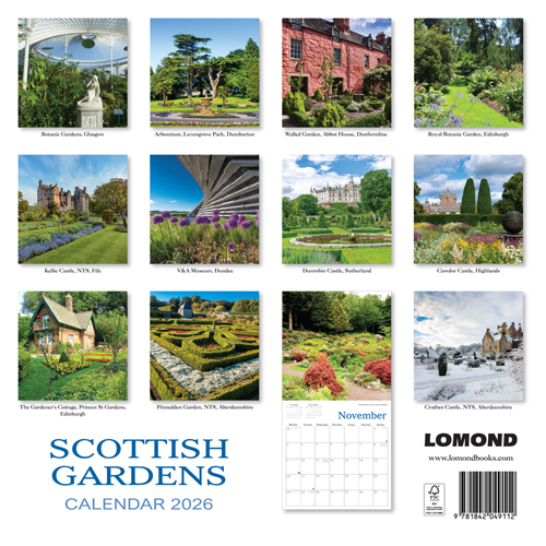 Enjoy wonderful scenic images throughout the year with our range of 2026 calendars. This 24 page wall calendar offers a full page for an image and a full page of date boxes below. The calendar dimensions are 30cm x 30cm (60cm x 30cm when opened). The selection of stunning images of Scottish Gardens included are: Botanic Gardens, Glasgow; Levengrove Park, Dumbarton; Abbot House, Dunfermline; Royal Botanic Garden, Edinburgh; Kellie Castle (NTS), Fife; V&A Museum, Dundee; Dunrobin Castle, Sutherland; Cawdor Castle, Highlands; Princes Street Garden, Edinburgh; Pitmedden Garden (NTS), Aberdeenshire; Ballindalloch Castle Gardens, Banffshire; Crathes Castle (NTS), Aberdeenshire. Our 2026 Lomond Calendars are in plastic free packaging.