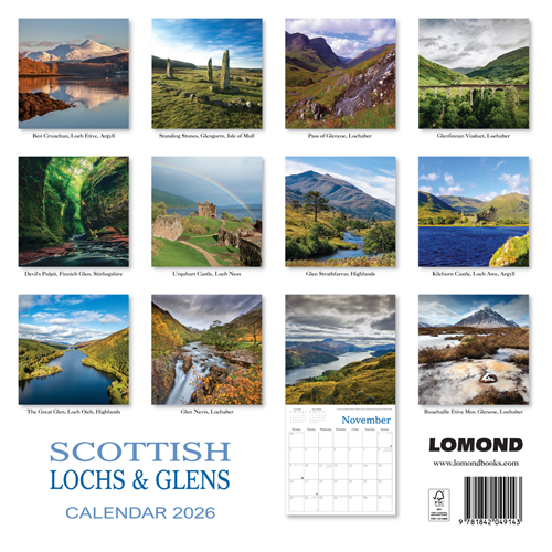 Enjoy wonderful scenic images throughout the year with our range of 2026 calendars. This 24 page wall calendar offers a full page for an image and a full page of date boxes below. The calendar dimensions are 30cm x 30cm (60cm x 30cm when opened). The selection of stunning images of Scotland included are: Ben Cruachan, Loch Etive, Argyll; Standing Stones, Glengorm, Isle of Mull; Pass of Glencoe, Lochaber; Glenfinnan Viaduct, Lochaber; Devil's Pulpit, Finnich Glen, Stirlingshire; Urquhart Castle, Loch Ness; Glen Strathfarrar, Highlands; Kilchurn Castle, Loch Awe, Argyll; the Great Glen, Loch Oich, Highlands; Glen Nevis, Lochaber; Loch Lomond, Trossachs; Buachaille Etive Mor, Glencoe, Lochaber. Our 2026 Lomond Calendars are in plastic free packaging. |
