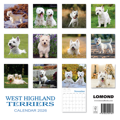 Enjoy wonderful scenic images throughout the year with our range of 2026 calendars. This 24 page wall calendar offers a full page for an image and a full page of date boxes below. The calendar dimensions are 30cm x 30cm (60cm x 30cm when opened). Featuring a wonderful collection of the tremendously popular dog breed, the West Highland Terrier. Our 2026 Lomond Calendars are in plastic free packaging.