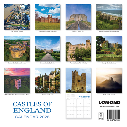 Enjoy wonderful scenic images throughout the year with our range of 2026 calendars. This 24 page wall calendar offers a full page for an image and a full page of date boxes below. The calendar dimensions are 30cm x 30cm (60cm x 30cm when opened). The selection of stunning images of English Castles included are: Tower of London; Herstmonceux Castle, East Sussex; Clifford's Tower, York; Bamburgh Castle, Northumberland; Durham Castle, County Durham; Elvaston Castle, Derbyshire; Warwick Castle, Warwickshire; Sizergh Castle, Cumbria; Haldon Belvedere (Lawrence Castle), Devon; Scotney Castle, Kent; Orford Castle, Suffolk; Corfe Castle, Dorset. Our 2026 Lomond Calendars are in plastic free packaging.