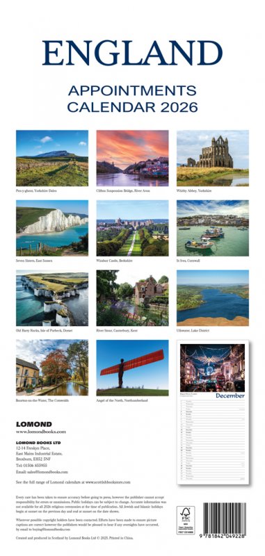 Enjoy wonderful scenic images throughout the year with our range of 2026 calendars. This 12 page appointments format calendar is a slim wall calendar with an image at the top of each page and a grid below with one line per day for reminders and engagements. The calendar dimensions are 35cm x 17cm. The selection of stunning images of England included are: Pen-y-ghent, Yorkshire Dales; Clifton Suspension Bridge, River Avon; Whitby Abbey, Yorkshire; Seven Sisters, East Sussex; Windsor Castle, Berkshire; St Ives, Cornwall; Old Harry Rocks, Isle of Purbeck, Dorset; River Stour, Canterbury, Kent; Ullswater, Lake District; Bourton-on-the-Water, the Cotswolds; Angel of the North, Northumberland; Regent Street, London. Our 2026 Lomond Calendars are in plastic free packaging.