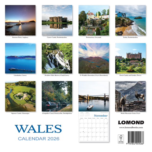 Enjoy wonderful scenic images throughout the year with our range of 2026 calendars. This 24 page wall calendar offers a full page for an image and a full page of date boxes below. The calendar dimensions are 30cm x 30cm (60cm x 30cm when opened). The selection of stunning images of Wales included are: Penmon Point, Anglesey; Carew Castle, Pembrokeshire; Portmeirion, Gwynedd; Tenby, Pembrokeshire; Llandudno, Conwy; Swallow Falls, Betws-y-Coed, Conwy; Yr Wyddfa (Snowdon), Eryri (Snowdonia); Powis Castle, Powys; Ogmore Castle, Glamorgan; Llangollen Canal, Pontcysyllte, Denbighshire; Menai Bridge, Anglesey; Welsh Mountain Goats, Eryri. Our 2026 Lomond Calendars are in plastic free packaging. |