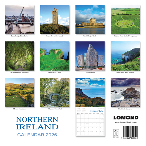 Enjoy wonderful scenic images throughout the year with our range of 2026 calendars. This 24 page wall calendar offers a full page for an image and a full page of date boxes below. The calendar dimensions are 30cm x 30cm (60cm x 30cm when opened). The selection of stunning images of Northern Ireland included are: Peace Bridge, River Foyle; Scrabo Tower, Newtownards; Carrickfergus Castle; Ballynoe Stone Circle, Downpatrick; the Dark Hedges, Ballymoney; Dunseverick Castle; Titanic Belfast; the Wishing Arch, Portrush; Mourne Mountains; Tollymore Forest Park; Fairhead towards Rathlin Island; the Giant's Causeway. Our 2026 Lomond Calendars are in plastic free packaging. |