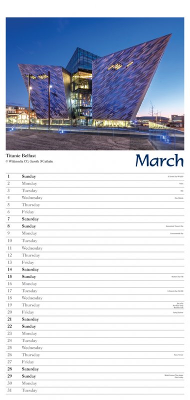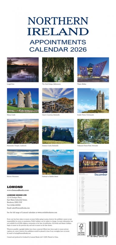 Enjoy wonderful scenic images throughout the year with our range of 2026 calendars. This 12 page appointments format calendar is a slim wall calendar with an image at the top of each page and a grid below with one line per day for reminders and engagements. The calendar dimensions are 35cm x 17cm. The selection of stunning images of Northern Ireland included are: Lough Erne; the Dark Hedges, Ballymoney; Titanic Belfast; Monea Castle; Giant's Causeway, Bushmills; Scrabo Tower, Newtownards; Mussenden Temple, Castlerock; Dunluce Castle, Bushmills; Tollymore Forest Park, Newcastle; Mourne Mountains; Fairhead to Rathlin Island; Belfast City Hall. Our 2026 Lomond Calendars are in plastic free packaging. |