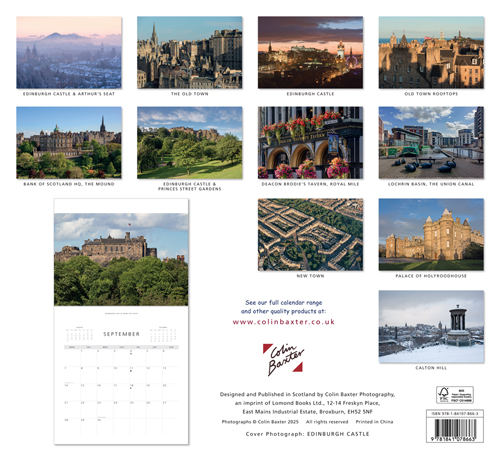From renowned Scottish photographer Colin Baxter, our range of calendars are fantastic additions to any home or office. This is a 24 page engagement style wall calendar, opening to double size with a full page image on the top and a date box grid below for note taking. The calendar's dimensions are 28cm x 30.5cm (56cm x 30.5cm when opened). Our 2026 range come in plastic-free packaging. Colin's selection of stunning images of Edinburgh are: Edinburgh Castle and Arthur's Seat; the Old Town; Edinburgh Castle at night; Bank of Scotland HQ, The Mount; Edinburgh Castle and Princes Street Gardens; Old Town Rooftops; Deacon Brodie's Tavern, Royal Mile; Lochrin Basin, Union Canal; Edinburgh Castle from the south; the New Town; Palace of Holyroodhouse; Calton Hill.