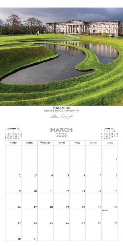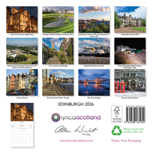 Featuring spectacular photography by Allan Wright, our range of 2026 calendars lets you bring Scotland in all its beauty into your home for the whole year. Our Lyrical Scotland range are 24 page wall calendars, offering a full page for the image and a full page for date boxes below. This range are supplied in plastic free envelopes suitable for posting, which can be opened to enclose a card or message and then resealed before sending. Our 2026 selection of images for Edinburgh are: John Knox House, High Street; Scottish National Gallery of Modern Art; Edinburgh Castle and Princes Street from Calton Hill; Newhailes House, NTS; Dynamic Earth, Scottish Parliament and Palace of Holyroodhouse; Circus Lane, Stockbridge; Royal Yacht Britannia, Leith; Royal Edinburgh Military Tattoo, Edinburgh Castle; Victoria Street; the Shore, Water of Leith; Forth Bridge; Deacon Brodie's Tavern. Calendar dimensions are 24cm x 24cm (48cm x 24cm when opened).