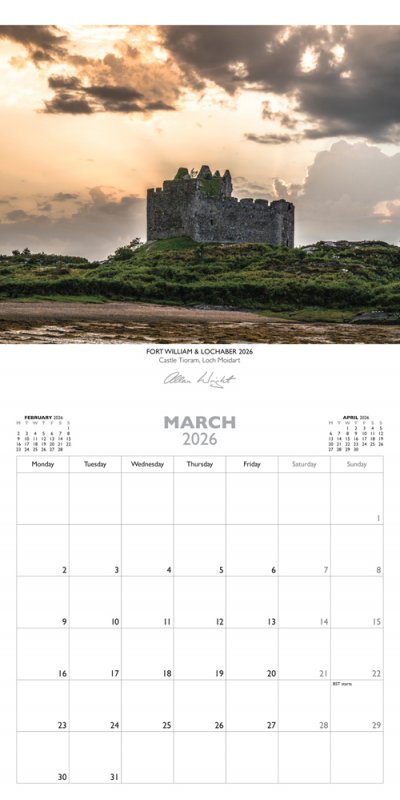 Featuring spectacular photography by Allan Wright, our range of 2026 calendars lets you bring Scotland in all its beauty into your home for the whole year. Our Lyrical Scotland range are 24 page wall calendars, offering a full page for the image and a full page for date boxes below. This range are supplied in plastic free envelopes suitable for posting, which can be opened to enclose a card or message and then resealed before sending. Our 2026 selection of images for Fort William and Lochaber are: Glenfinnan Monument, NTS; Caledonian Canal, Loch Lochy; Castle Tioram, Loch Moidart; Glencoe Lochan; Glen Etive, Loch Etive; the Jacobite, Glenfinnan Viaduct; Small Isles from Arisaig; Mallaig; Glen Nevis; Inverlochy Castle; Polnish, Lochailort; Buachaille Etive Mor. Calendar dimensions are 24cm x 24cm (48cm x 24cm when opened). |