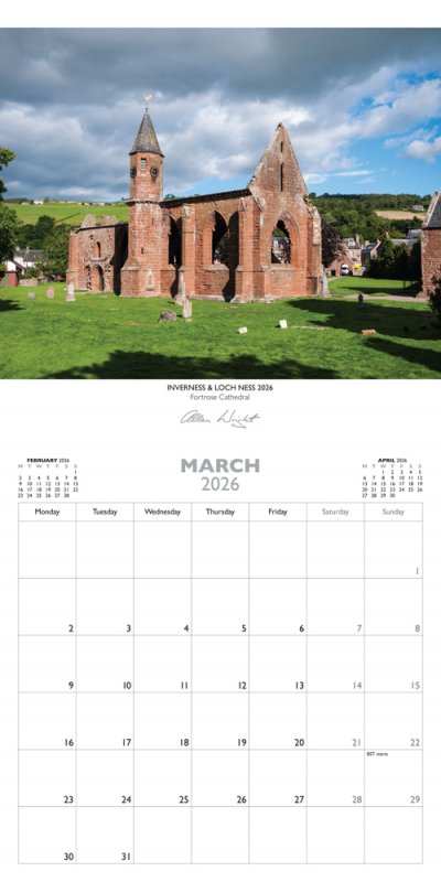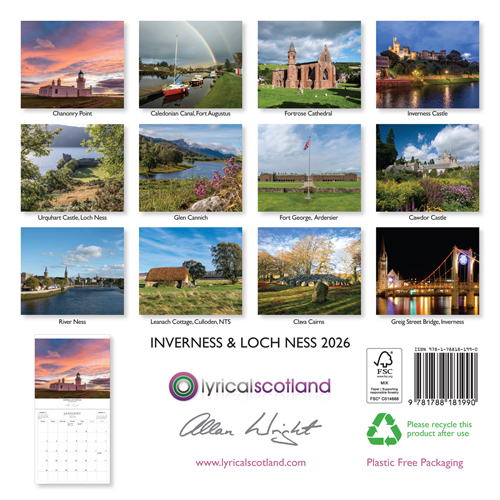 Featuring spectacular photography by Allan Wright, our range of 2026 calendars lets you bring Scotland in all its beauty into your home for the whole year. Our Lyrical Scotland range are 24 page wall calendars, offering a full page for the image and a full page for date boxes below. This range are supplied in plastic free envelopes suitable for posting, which can be opened to enclose a card or message and then resealed before sending. Our 2026 selection of images for Inverness and Loch Ness are: Chanonry Point; Caledonian Canal, Fort Augustus; Fortrose Cathedral; Inverness Castle; Urquhart Castle, Loch Ness; Glen Cannich; Fort George, Ardersier; Cawdor Castle; River Ness; Leanach Cottage, Culloden, NTS; Clava Cairns; Greig Street Bridge, Inverness. Calendar dimensions are 24cm x 24cm (48cm x 24cm when opened). |