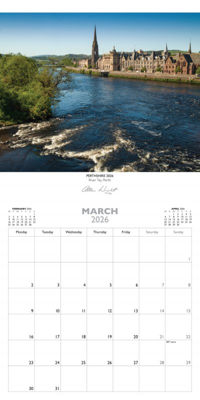 Featuring spectacular photography by Allan Wright, our range of 2026 calendars lets you bring Scotland in all its beauty into your home for the whole year. Our Lyrical Scotland range are 24 page wall calendars, offering a full page for the image and a full page for date boxes below. This range are supplied in plastic free envelopes suitable for posting, which can be opened to enclose a card or message and then resealed before sending. Our 2026 selection of images for Perthshire are: Croft Moraig Stone Circle, by Kenmore; Queen's View, Loch Tummel; River Tay, Perth; Ossian's Hall, Back Linn Falls, Dunkeld; Kinnoull Hill, River Tay; Balvaird Castle; Barley Field, Carse of Gowrie; Blair Castle, Blair Atholl; Crieff; Ben Vrackie, Atholl Palace Hotel, Pitlochry; Blairgowrie; Ben Lawers, Loch Tay. Calendar dimensions are 24cm x 24cm (48cm x 24cm when opened).